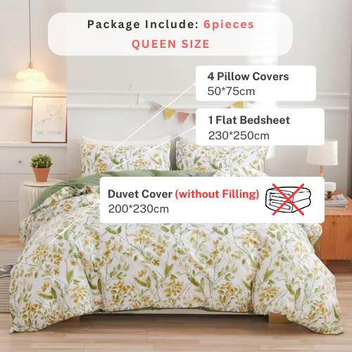 Package bag - Queen Size 6 Pcs Includes: 1 Duvet cover - 200*230cm. 1 Flat sheet - 230*250cm. 4 Pillow covers - 50*75cm. Suitable for mattress size 140*200cm to 160*200cm and thickness maximum 23cm. This data was obtained from manually measuring the product, it mat be off by 1-2cm. Soft fabric: cotton 80%, polyester 20%, 90 GSM. PLEASE NOTE: DUVET(COMFORTER) IS NOT INCLUDED. Soft fabric: cotton 80%, polyester 20%, 90 GSM. Care tips: Machine washable in cold water and tumble dry at low temperature, do not bleach. It is recommended that you turn the bedding set over when washing.
