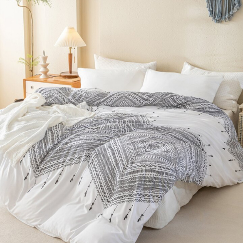 Perfect for those who appreciate a minimalist aesthetic with a touch of bohemian flair, this bedding set combines style and comfort seamlessly. The intricate patterns in contrasting black and white add an artistic element to your bedroom, creating a space that feels both sophisticated and inviting. Made from high-quality materials, each piece is designed to be soft to the touch, ensuring a restful night's sleep. Whether you're redecorating your room or looking to refresh your bedding collection, this set is a versatile choice that complements a variety of decor styles.