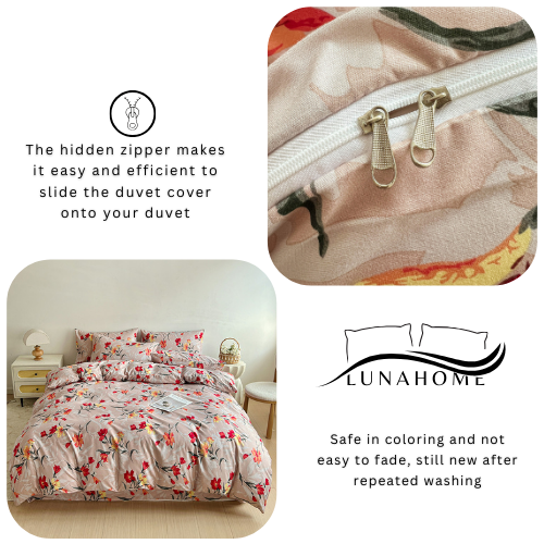 The vibrant orange Luna Home floral design adds a splash of color and warmth to any bedroom, transforming the space into a cozy retreat. The soft, breathable fabric ensures a comfortable night's sleep, while the intricate patterns bring a touch of elegance and sophistication. This duvet cover set is not only a stylish addition but also easy to care for, making it a perfect choice for those who appreciate both beauty and practicality in their home decor.